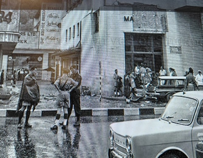 Explosión en Macdonald House. Mi padre (oficial de policía) aparece de espaldas en la foto. Aproximadamente 1965.